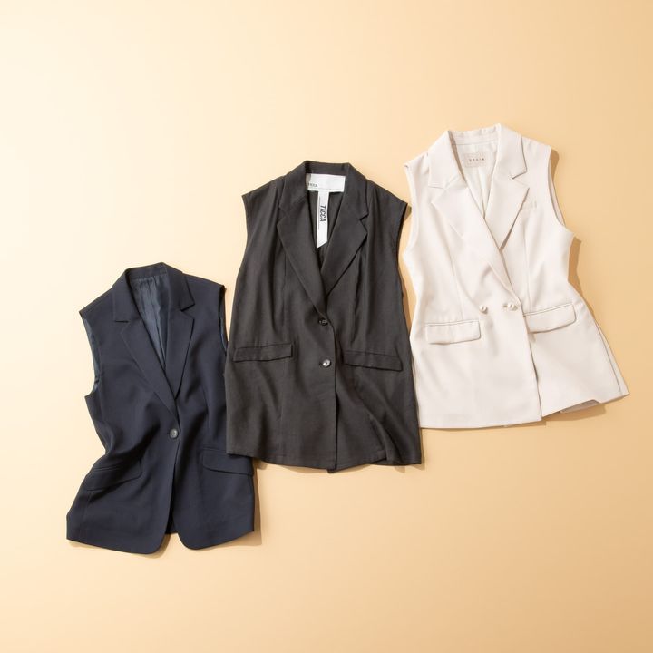 トレンドアイテムの短丈ジレはスタイルアップ効果も狙えるのが嬉しい。シングルブレストにダブルブレスト、バックスタイルにデザインがあるものなどバリエーションも豊富。