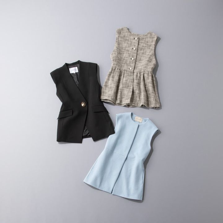 上から順に ツイードジレ¥17,930(シップス)ブラックジレ¥29,700(アルページュストーリー)ブルージレ¥29,920(ユナイテッドアローズ)