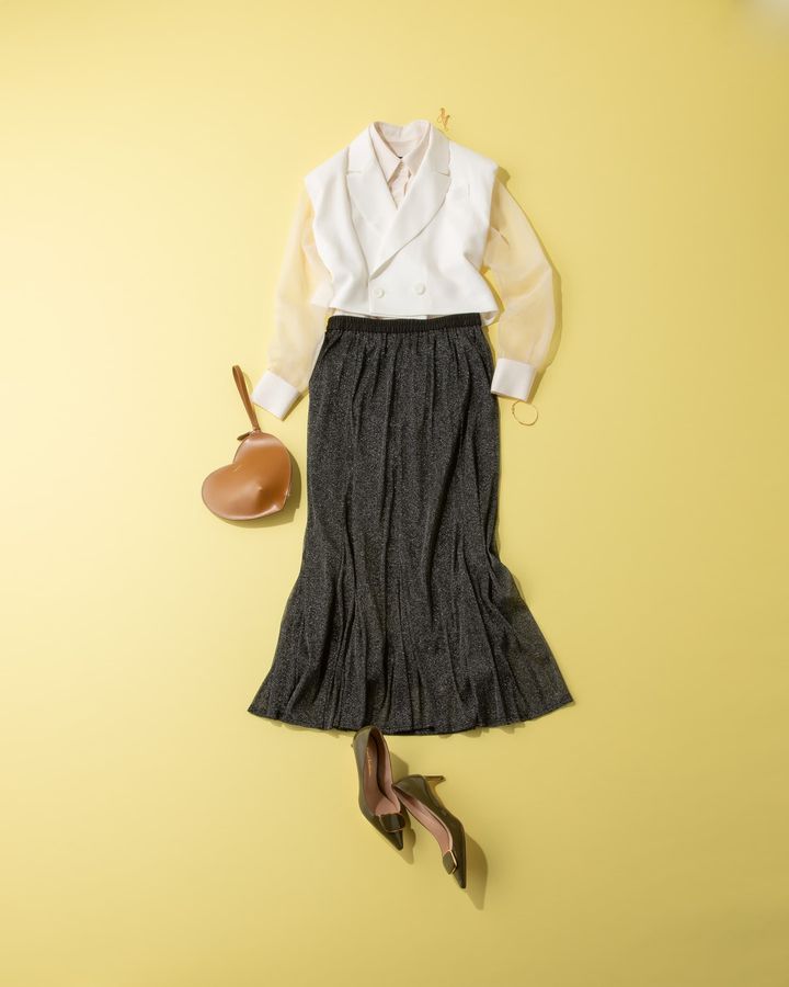 今季のラメスカートは、ギラつかない程よい輝きなものが多くオススメです。スカートのシルエットがコンサバなので、新鮮な印象の短丈ジレを合わせてマジメ過ぎを回避!