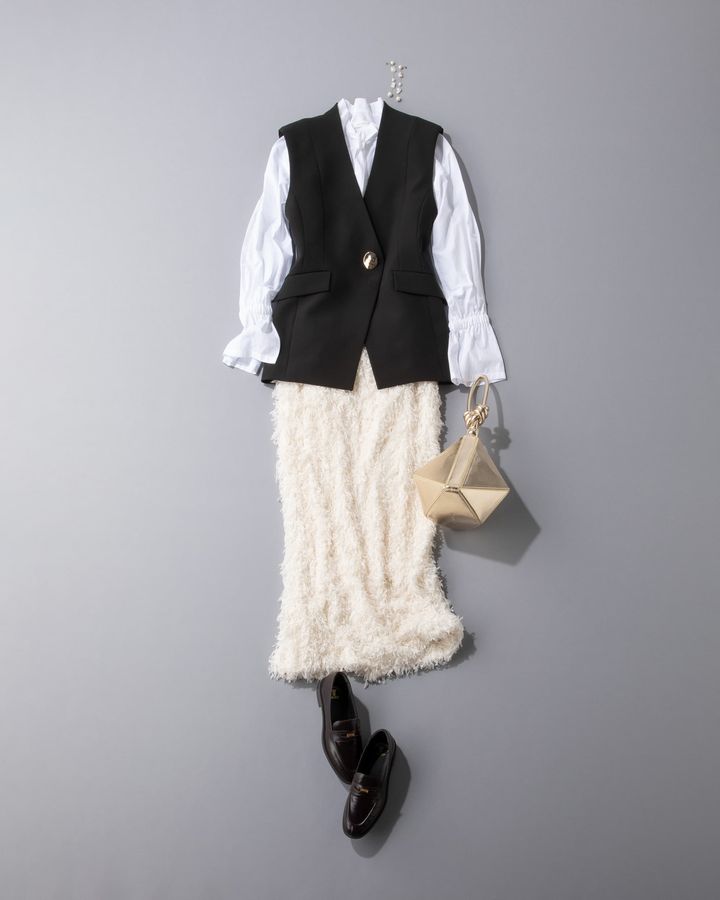 白いもけもけ素材がトレンド感満点なスカートはウキウキ気分な夜のお出掛けにぴったり!シェイプされたウエストを大きなボタンでさらに引き締めるジレをあわせれば、スタイルアップ効果も狙えます。