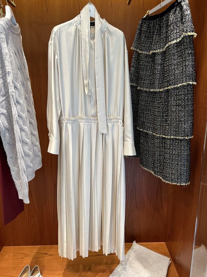 たった1枚纏うだけで洗練度を高める知的ワンピース。取り外し可能なボウタイ付きで首回りもスマートに。ウエスト部分にはドロストが付いているので自分好みのスタイルが叶います。大きめなプリーツの内側には三重のプリーツがMIXされ、リズミカルに動くワンピース姿は絵になる存在感に。