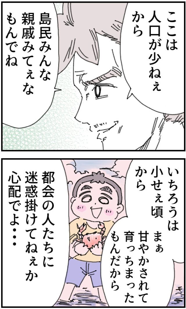 するとお父さんが急に真面目な顔つきになり「ここは人口が少ねぇから、島民みんな親戚みたいなもんでね。いちろうは小せぇ頃からまぁ甘やかされて育っちまったもんだから、都会の人たちに迷惑掛けてねぇか心配でよ・・・」と、小さな島で育ったいちろうさんが都会でうまくやれているのかと心配そうに話します。