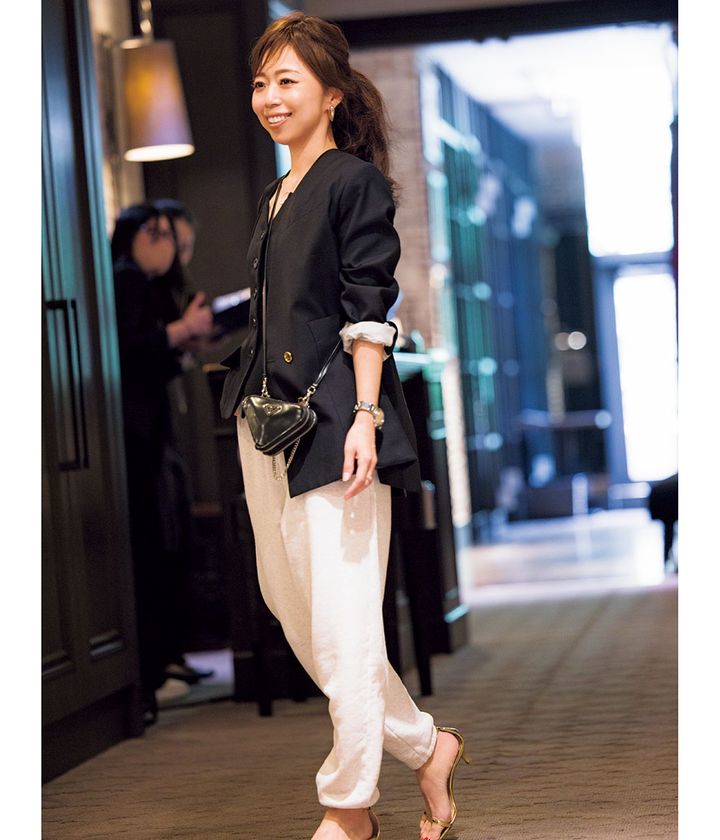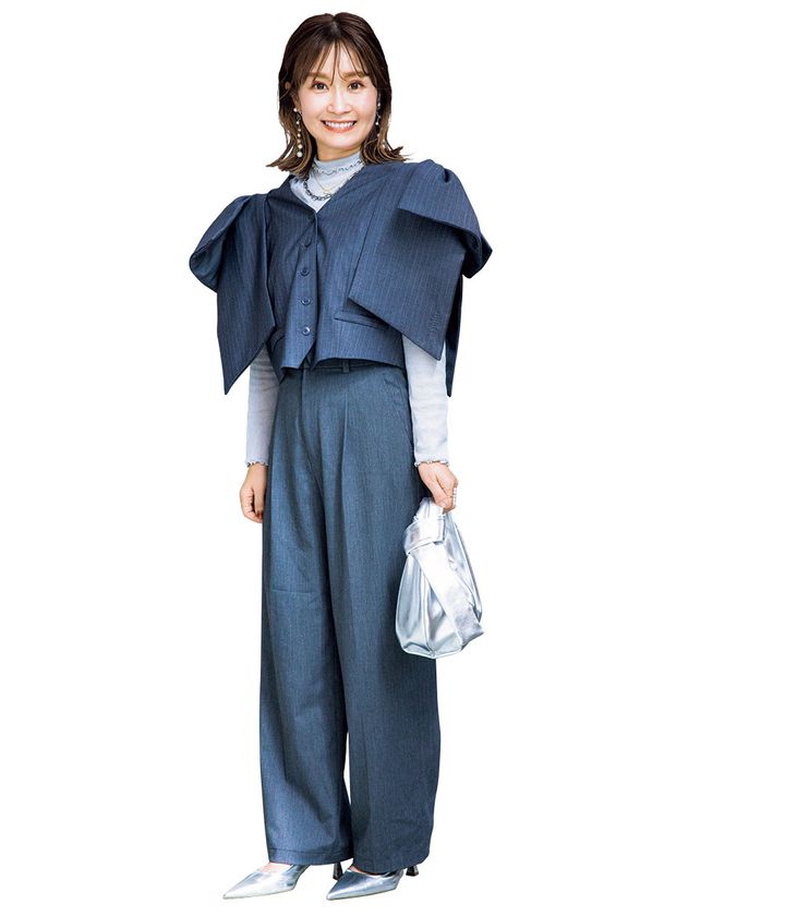 『ゆるっとしたシルエットのパンツに、スパンコール付きのジレでメリハリをつけるのが今の気分。足元もスニーカーにして、とことんチルを加速させます。』