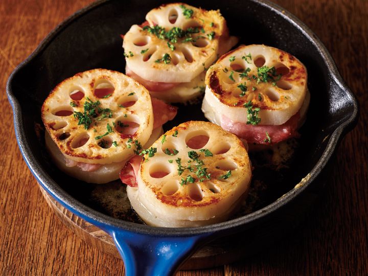 シャキシャキのれんこんに、生ハムの塩けとチーズのまろやかさが絶妙にマッチ。見た目も映えるので、おもてなしの場でも大活躍間違いなしです。