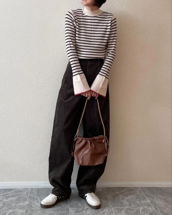 コーデュロイバレルレッグパンツの雰囲気を上手に活かすなら、ゆったりシルエットのボーダートップスを合わせた、大人カジュアルコーデもいいですね。全体的にオーバーサイズでまとめることで、華奢な雰囲気を演出できます。