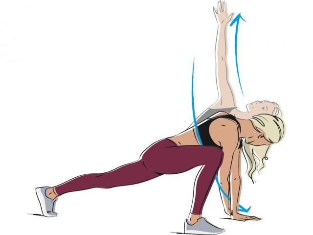 a. フルプランクの姿勢になり、右足を右手の外側に踏み出す。左手を床に押し付けながら、右手を天井に向かって持ち上げ、背中をひねる。