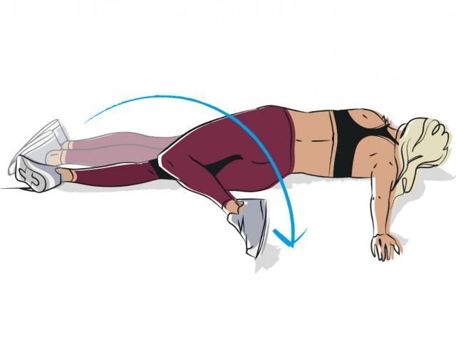 b. 胴体を前方に傾け、さらにストレッチを深める。フルプランクの姿勢に戻る。これで1回。片足それぞれ6〜8回ずつ。