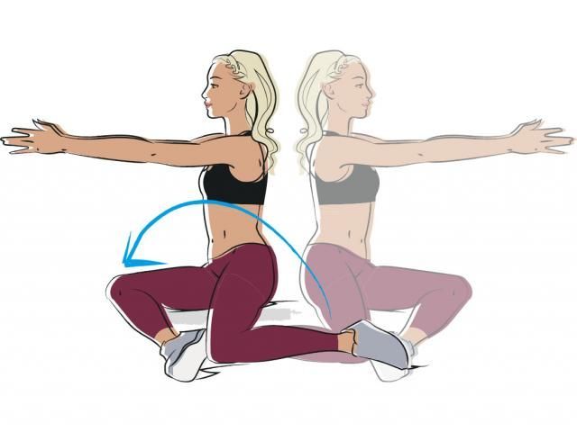 左足を大きく横に一歩出し、お尻を後ろに押し出しながら、左膝を90度に曲げる。 ここまでで約2秒。 体を押し上げてスタートポジションに戻る。これで1回。片足それぞれ10~12回ずつ。