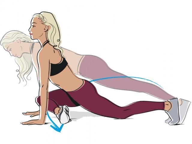 a. フルプランクの姿勢でスタート。右脚を前に出し、右手の手前で右膝を曲げる。右足は左手の手前にくるように。初めのうちは少しきつく感じるかもしれない。