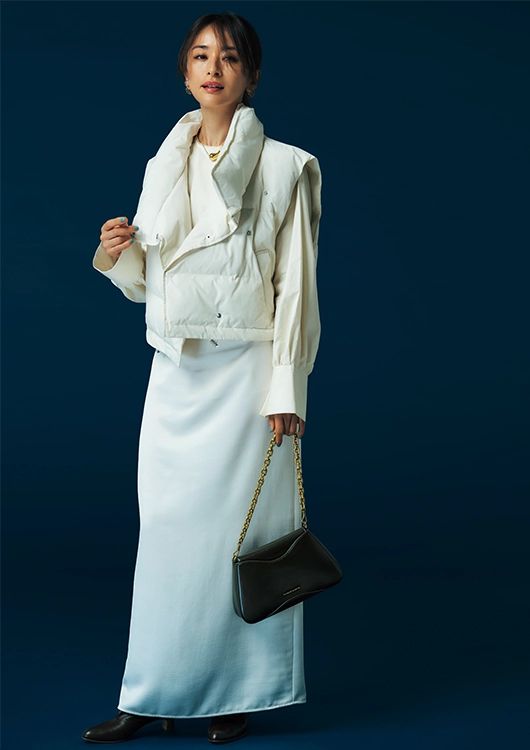ショート丈のダウンに合わせたのはナローなサテンスカート。テンションの異なるこんな素材合わせで、白のワントーンに抑揚を。
