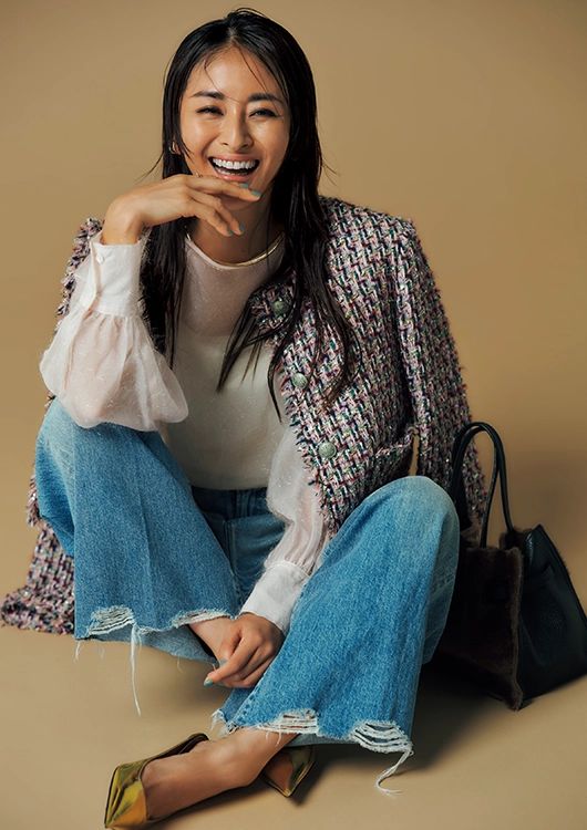 ツイードジャケット¥132,000、 ブラウス¥35,200、デニムパンツ¥ 39,600/以上ウィム ガゼット、パンプス¥ 72,600/ペリーコ(以上ウィム ガゼット ル ミネ新宿店) イヤカフ¥3,080、リング¥ 3,080/ともにヘンカ(ロードス) チョーカ ー¥7,150/ロニ バッグ¥28,600/ヴィオ ラドーロ(アルアバイル)