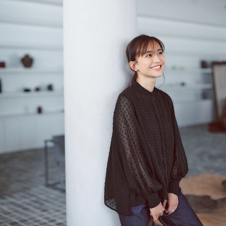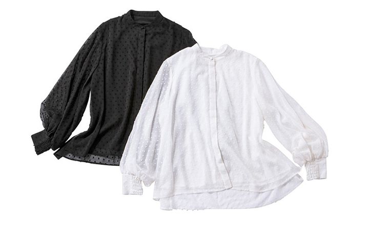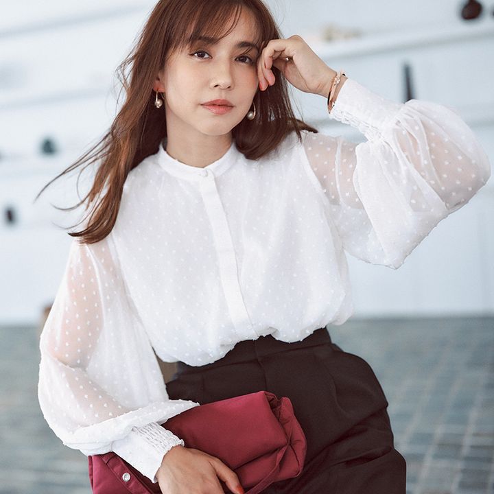 水玉シアーブラウスに、身頃のみ同色系のインナーをドッキング。しっかりボリュームをつけた袖も腕の肌感を上品に軽減。カフス内側には腕まくりをしやすくするシャーリングゴム入り。