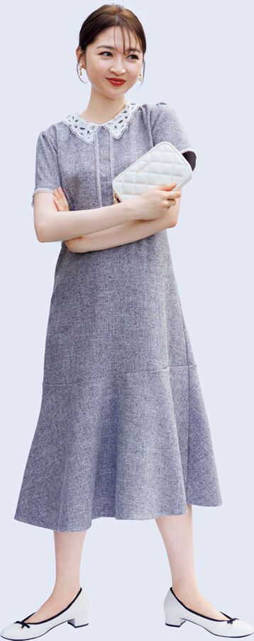 令嬢ライクなえり付きワンピースを、大人可愛いフラ ットシューズでハズすのがオードリー流。ミニリボンやパインピングを効かせたデザインはもちろん、低めのヒールでさりげなくスタイルアップもできてコスパ◎。