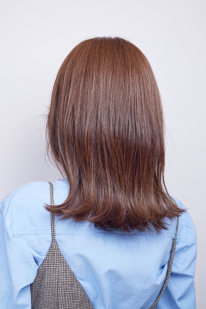 髪質の変化によって顔まわりや表面にアホ毛のようなパヤパヤとした毛が増えがち。悪目立ちすると、髪が傷んでいる!という印象にも。そこで柔らかいツヤめきを与えるシアーな髪色とトリートメントで対策を。仕上げにポイントスティックを使うのも効果的です。縦長バランスの爽やかなミディアムをキレイな質感で一層楽しんで!