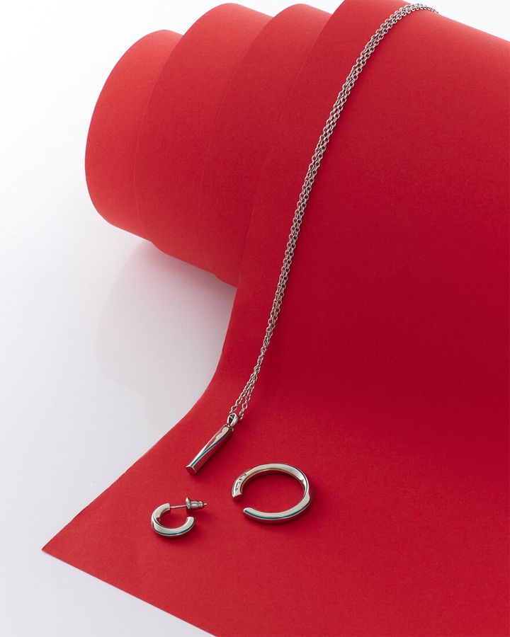 角線状の四隅にあしらわれたエッジラインがシグネチャーカラーを引き立てる繊細なデザインや、華奢なボタンモチーフが柔らかな輝きを放つゴールド、ポリッシュとマット仕上げの2つのテクスチャーが重なり合った重厚なシルバーなど、上品なユーモアを携えたアイテムたちがコレクションをさらに彩った。