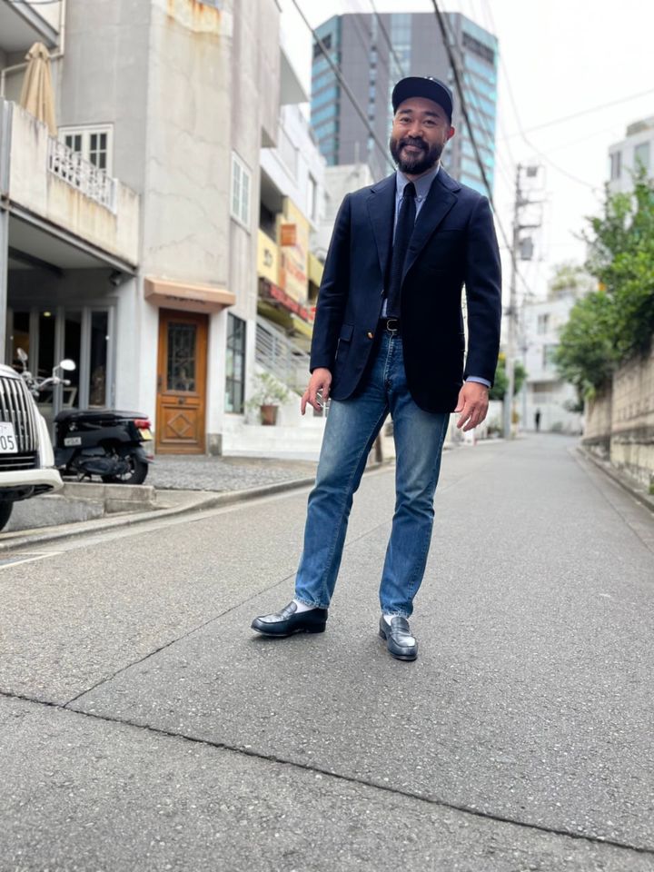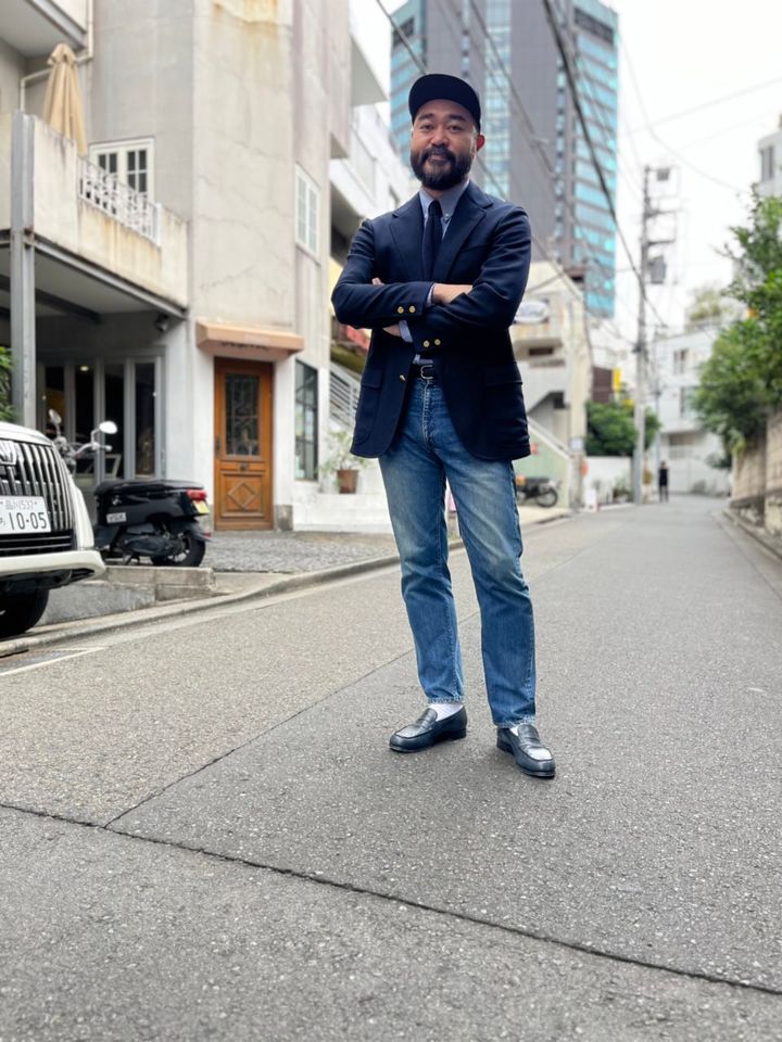 大のトラッド好きということもあり、この時期にぴったりなホップサック生地のブレザーをチョイスした中室さん。「王道トラッドだとコスプレっぽく見えてしまうので、今回は小物でカジュアルダウンさせました。足元はヒモ靴よりラフなローファーと白ソックス、さらにもう少し崩したかったのでベースボールキャップをプラスしています」