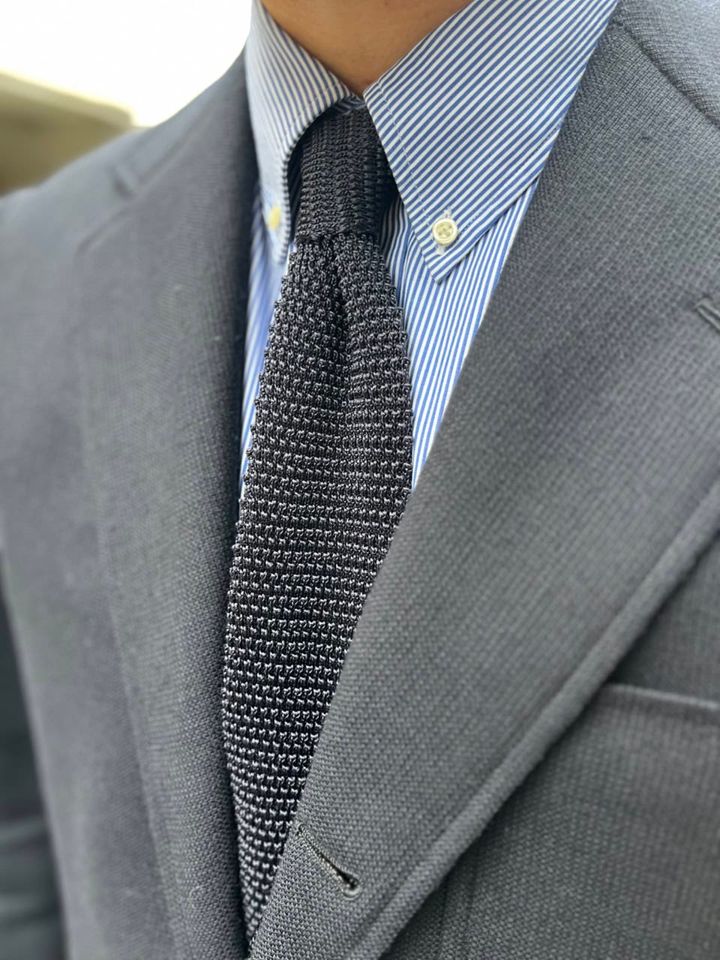 ブルー系で統一したVゾーンはメンズならでは。異なるトーンでメリハリをつけているのも見どころ