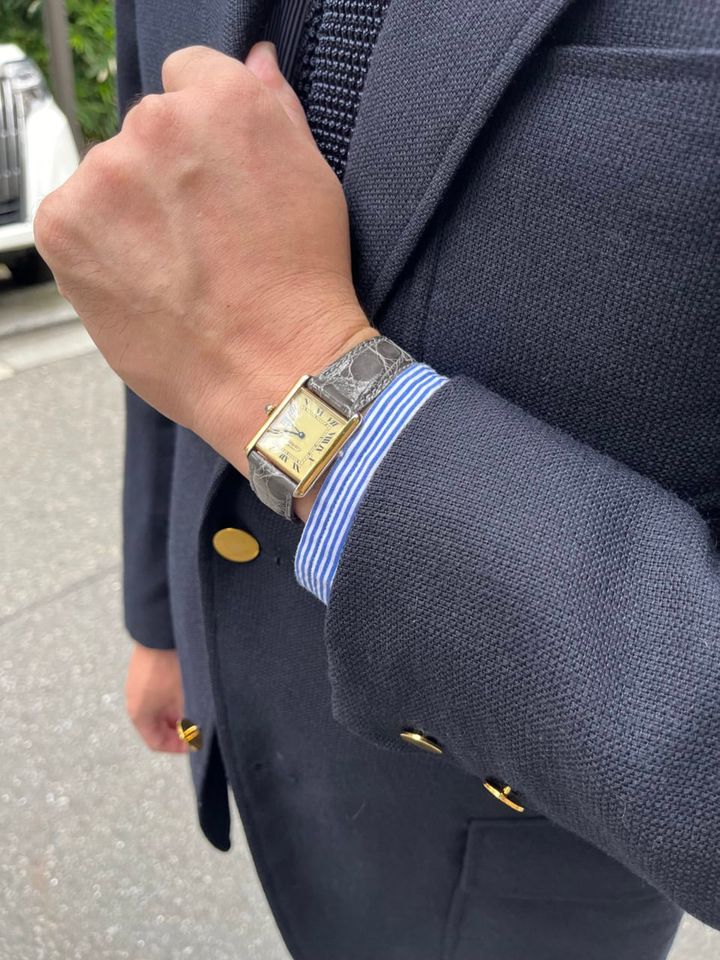 カルティエの「サントス」にグレーのクロコストラップという、センスのよさが光る手元。ブレザーのゴールドボタンも絶妙なアクセントに