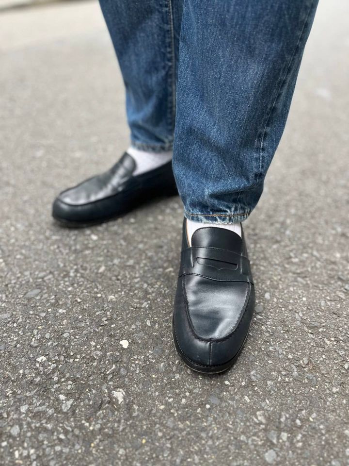 ローファーもさりげなくネイビーをチョイス。ジーンズの丈感やソックスの見え具合も秀逸
