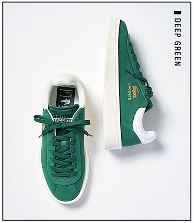 グリーンロゴスニーカー 19,800円/LACOSTE(ラコステお客様センター) クラシカルな服と相性のいいコクのあるグリーン。ハードなボディで形がくずれにくい。