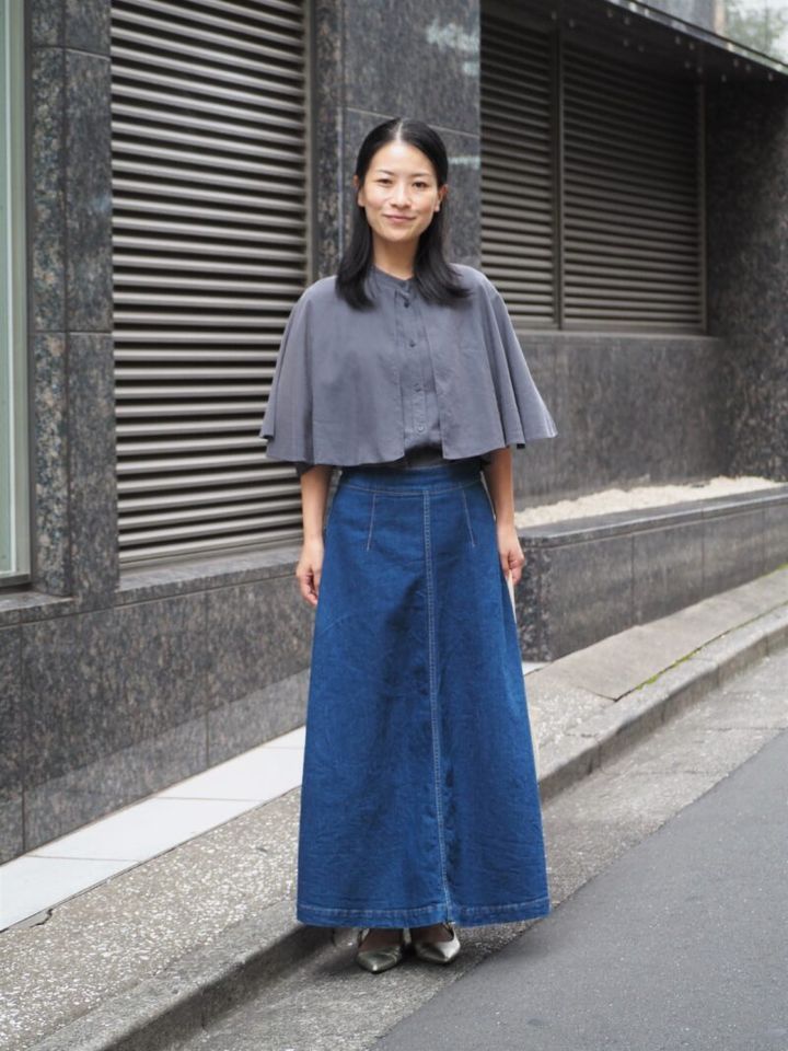 普段からきれいめな着こなしが多いという山本さん。デニムはパンツよりもスカート派なのだそう。「このスカートはラインが美しくて女性らしいアイテムとも相性がよく、手持ちの洋服と合わせやすいんです。少しカジュアル要素を取り入れたいときに重宝します」