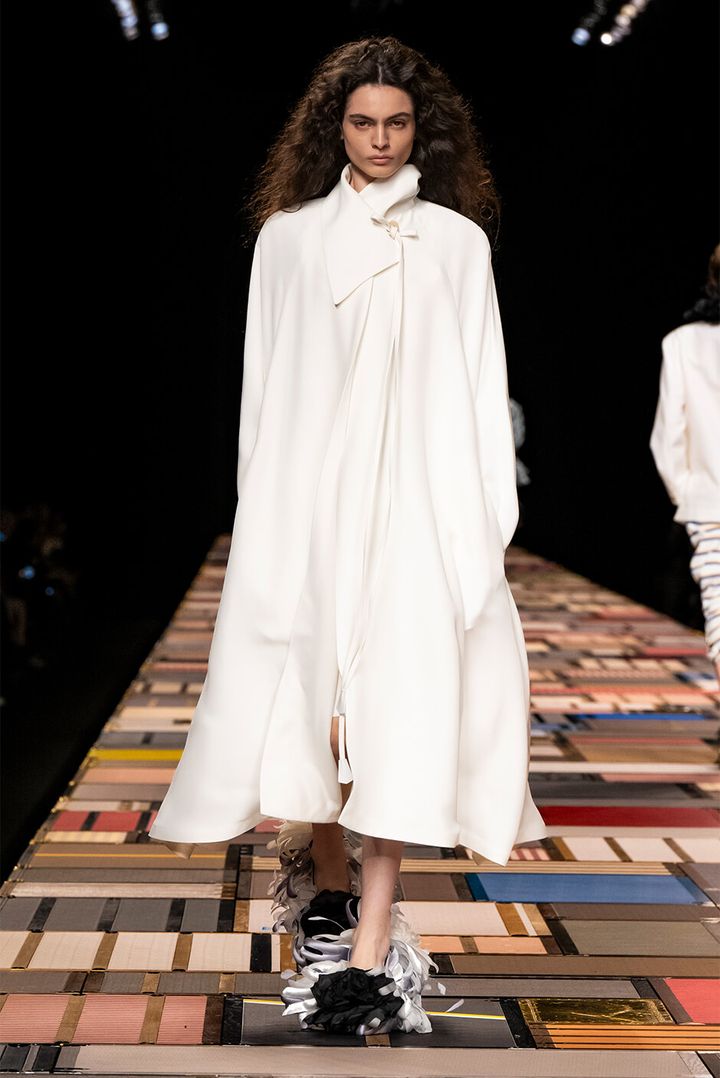 伝統的な「サヴォアフェール(匠の技)」と、「アール・ドゥ・ヴィーヴル(豊かなライフスタイル)」を兼ね備えた文化的特異性のもと、「ソフト」と「パワー」という対立する2つの概念の調和が試みられ、華やかなルックの数々がランウェイを彩った。