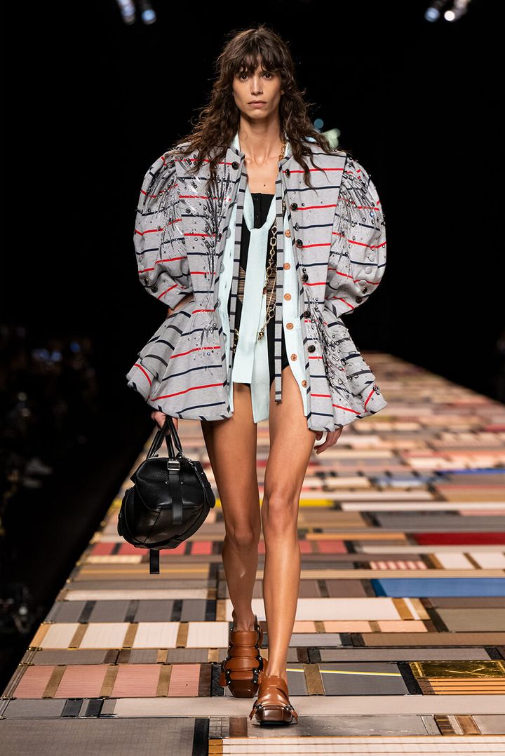 彼の作品をデザインに落とし込んだ半袖ジャケットやトランクバッグなどが、独創的な雰囲気でランウェイを包み込んだ。