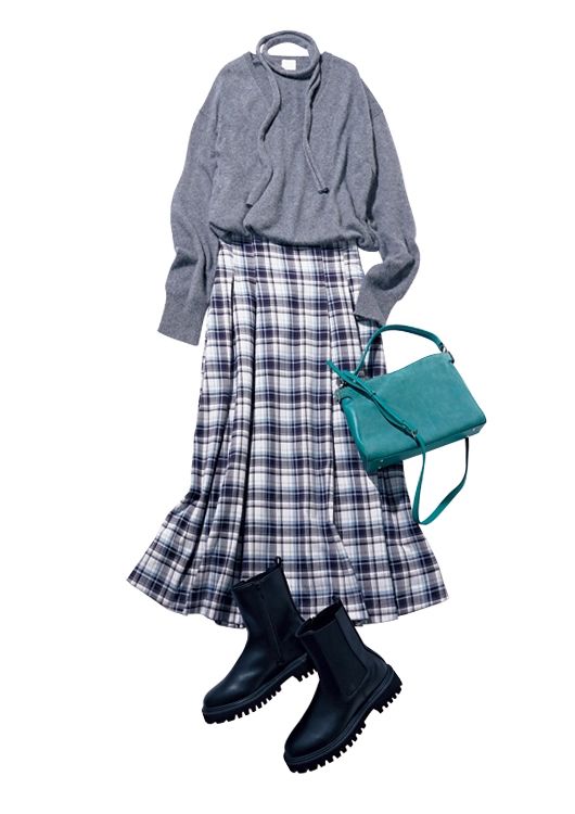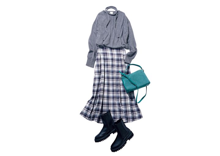 チェックスカート¥15,400/MERCURIDUO(MERCURYDUO ルミネエスト新宿店) ストール付きニット¥16,500/リエル リシェ ショートブーツ¥15,000/PLST グリーンバッグ¥39,600/銀座かねまつ(銀座かねまつ6丁目本店)