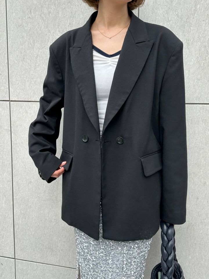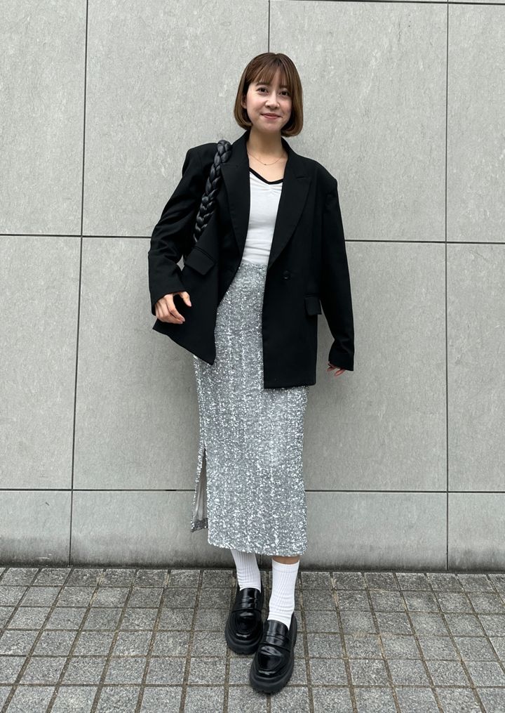 「ジャケットスタイルでシックな印象ながら、グリッター素材のスカートを合わせて華やかになるようコーディネートしました。肩にパッドが入ったジャケットは、オーバーサイズで着ると新鮮なアクセントになりやみつきに! ちなみにこれは2着目に購入した肩パッド付きジャケットです」