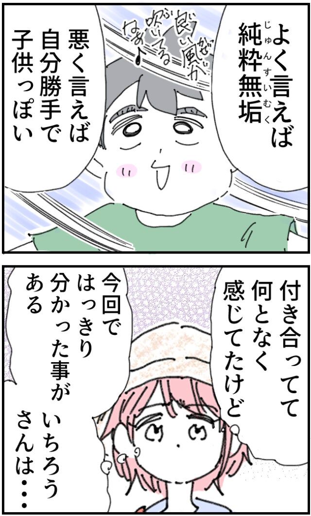 「よく言えば純粋無垢。悪く言えば自分勝手で子供っぽい。付き合ってて何となく感じてたけど、今回ではっきり分かった事がある。いちろうさんは・・・」