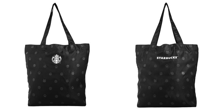 タオルと同じ、猫&肉球アイコンがあしらわれた黒のトートバックも。目を凝らすと見えてくるモチーフは、さり気ない猫好き匂わせに好適であります。