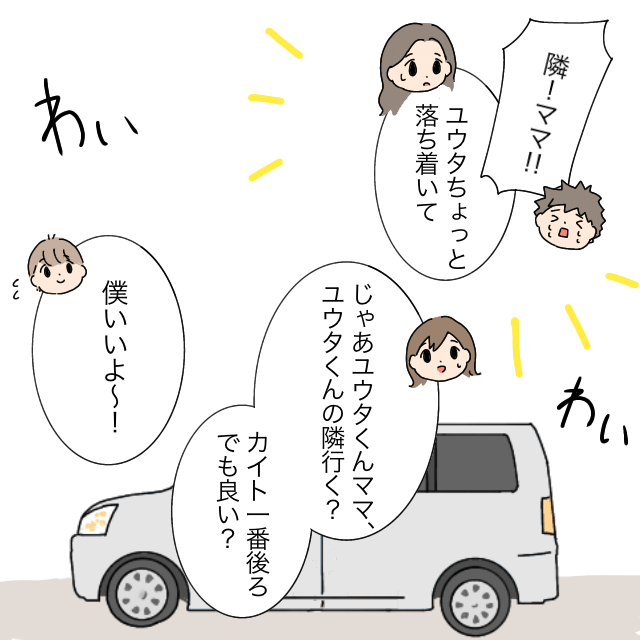 「隣!ママ!!」「ユウタ、ちょっと落ち着いて」とやりとりするユウタくんとママ、それを見たいくこさんは「じゃあ、ユウタくんママ、ユウタくんの隣行く?カイト、一番後ろでも良い?」とカイトくんにたずね、「僕いいよ~!」と言ってくれました。