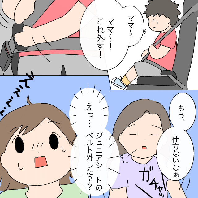 すると、「ママ~!ママ~!これ外す!」と言い出してしまったユウタくん、すると「もう、仕方ないなぁ」と呟いたユウタくんママは「ガチャッ」とジュニアシートのベルトを外してしまい、「えっ・・ジュニアシートのベルト外した??」いくこさんは運転しながら動揺してしまいました。
