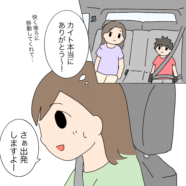 そして、カイトくんが一番後部座席に1人で座り、ユウタくんの隣にはユウタくんママ、「カイト、快く後ろに移動してくれて本当にありがとう~!」いくこさんはカイトくんに感謝しつつ、「さぁ、出発しますよー」とみんなに声を掛けました。