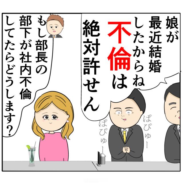 「娘が最近結婚したからね。『不倫』は許せん」と話す部長の言葉に、「ぱぴゅーぱぴゅー」と動揺しまくりの良し男さん、すると「もし部長の部下が社内不倫してたらどうします?」と背苦腹さんがたずねました。