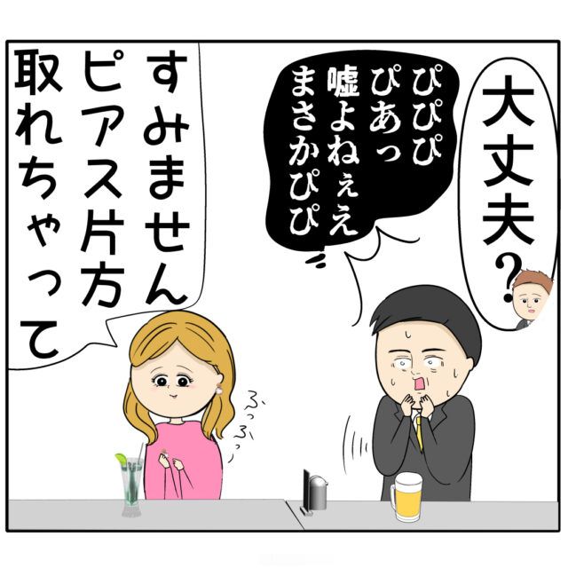 「大丈夫?」背苦腹さんがそう言うと「すみません、ピアス片方取れちゃって」ふふふと笑いながら答えるふり子さん。そのやりとりに「ぴぴぴ・・ぴあっ・・嘘よねぇぇ・・まさかぴぴ(汗)」良し男さんはしどろもどろで焦りまくる良し男さん。