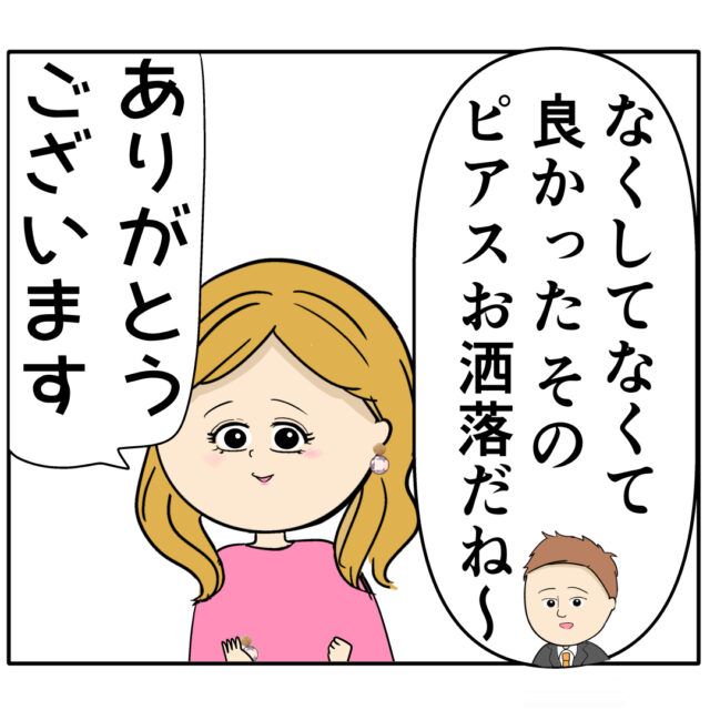 「なくしてなくて良かった。そのピアスお洒落だね~」背苦腹さんの言葉に「ありがとうございます」とお礼を言うふり子さん。