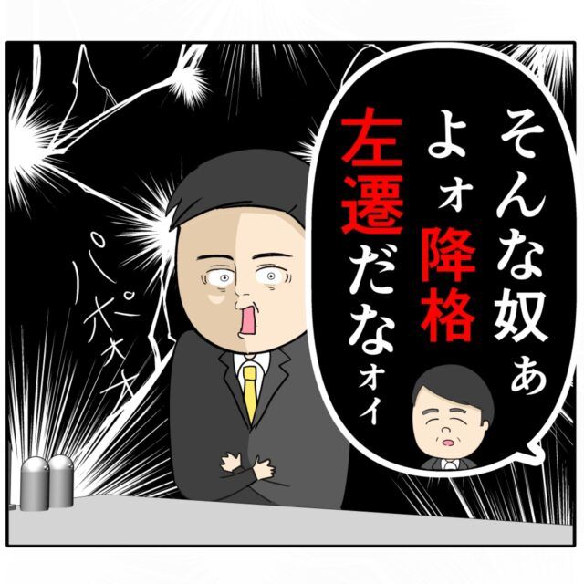 「そんな奴ぁよォ降格左遷だなオイ」と言う部長の言葉を聞いて「!!!」と衝撃を受ける良し男さん。