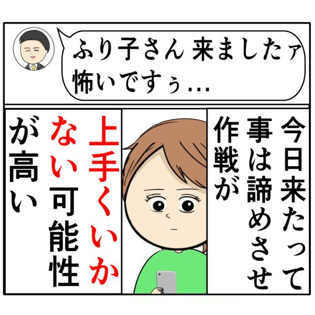 そして、「ふり子さん来ましたァ。怖いですぅ・・・」良し男さんがすみれさんにメールを送ろうとすると、「今日来たって事は諦めさせ作戦が上手くいかない可能性が高い・・」すみれさんは考えこみました。