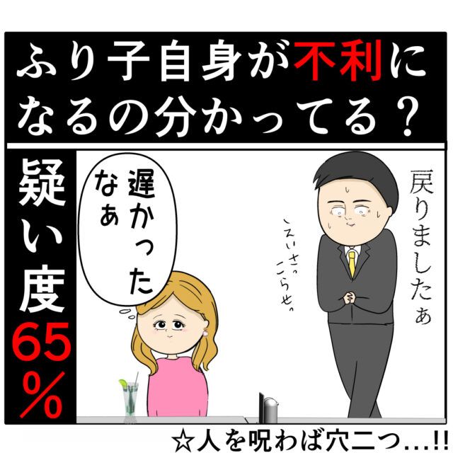 「ふり子自身が不利になるのわかってる?」すみれさんは、ふり子さんが不利になることを見越しているかのように呟きました。そして、座席に戻った良し男さんを医て、「遅かったなあ」と呟きながら、良し男さんの帰りを待っていました。