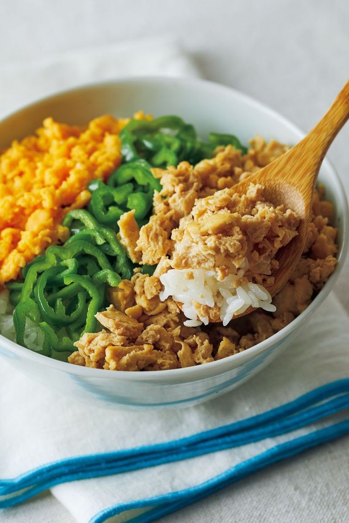 (3)フライパンにサラダ油小さじ1をたして中火で熱し、冷凍豆腐を手でつぶしながら入れる。木べらで細かくくずしながら2分ほど炒め、〈A〉を加えてさらに30秒ほど炒める。器にご飯を盛り、豆腐と(1)(2)をバランスよく盛る。