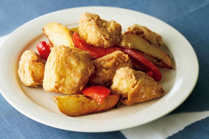 (1)冷凍豆腐は一切れを3等分に割る。ボールに下味の材料を混ぜ、豆腐を入れてかるく押しながら全体に味をつける。別のボールに片栗粉、小麦粉各大さじ1と1/2を混ぜる。ペーパータオルなどでかるく汁けを押さえた豆腐を入れ、しっかり粉をつけて押さえる。