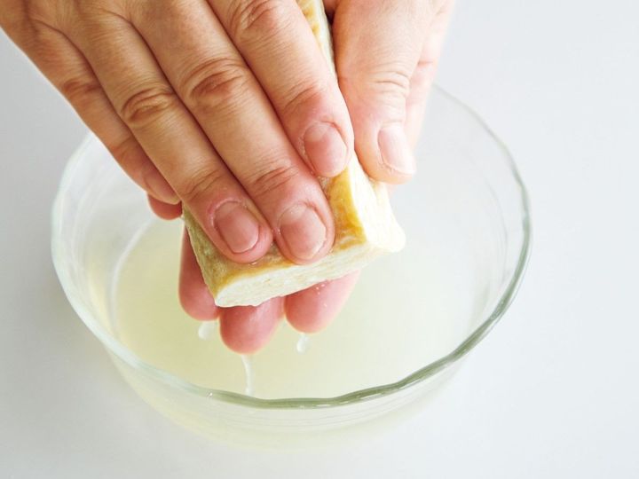 豆腐を袋とパックから取り出して耐熱のボールに入れ、ラップをかけて電子レンジで6分加熱する(水が出るので、皿はNG)。時間があるときは、冷蔵室で自然解凍も可。
