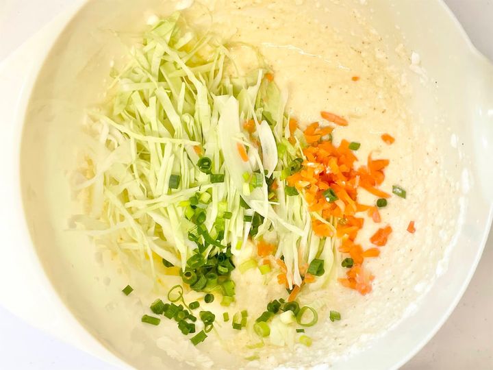 3. キャベツ、青ねぎ、紅しょうがを加えて混ぜます。