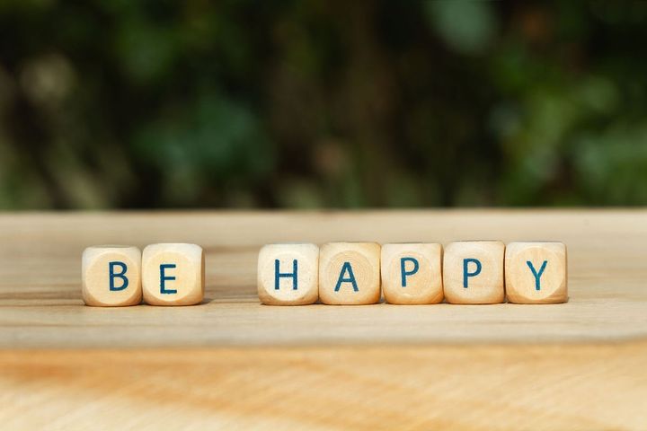 Be happy short phrase made with wooden letter blocks on a wooden table