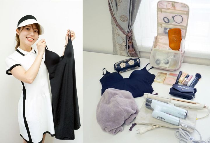 写真左上から時計回りにメイクポーチ、スキンケア&ヘアブラシなどヘアケアグッズ入りのフック付きトラベルポーチ、メイク用品、ヘアアイロン、ドライヤー、ヘアドライタオル、ブラ付きロングキャミソール