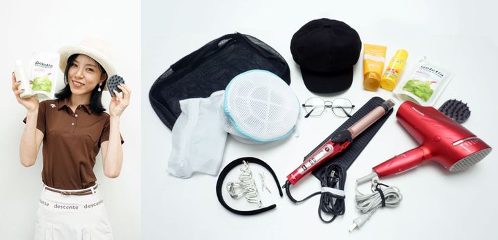 飯島さんの荷物はとにかくコンパクト。だって、これで全部ですよ。ゴルフではなくオフィスに行くような大きさ、ともすると、荷物多めの人のカートバッグのようなサイズのバッグ内には、1回分の化粧水やヘアオイル、ミニサイズのワセリンなどが入っており、荷物のスリム化、軽量化を極めています。