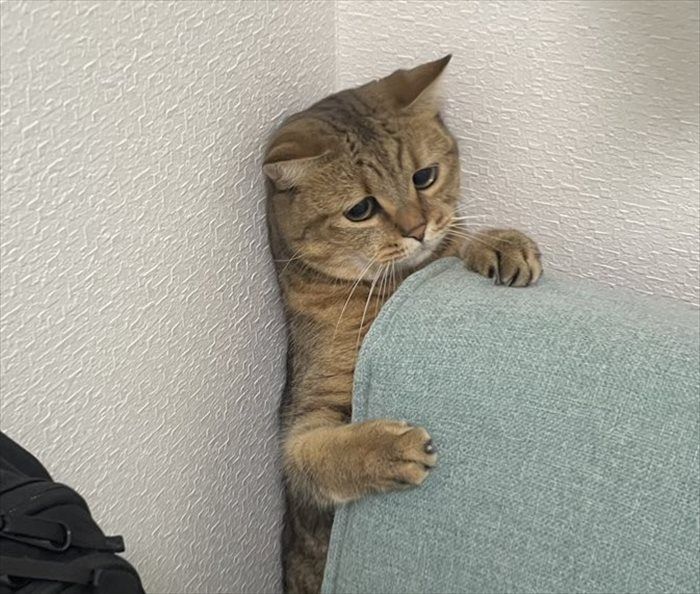 ソファーの隙間から出られない!ネコが絶望してる姿が話題に「この困ったような顔が好き」「模様が眉に見えて絶妙な表情」