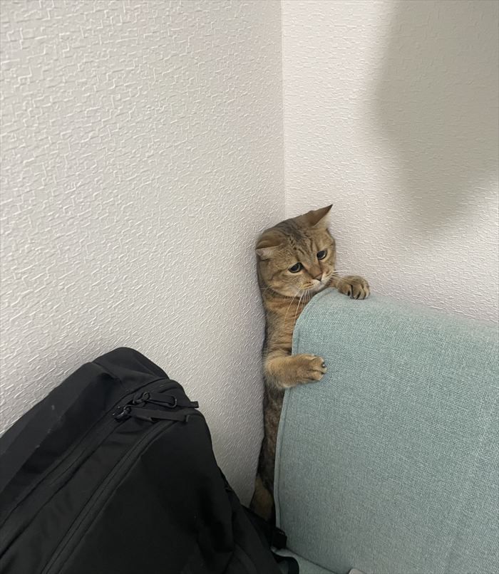 なんと、ソファーと壁の間にはさまってしまっていたのです! どうやら、お腹がつっかえて出られなくなってしまったようです・・・。