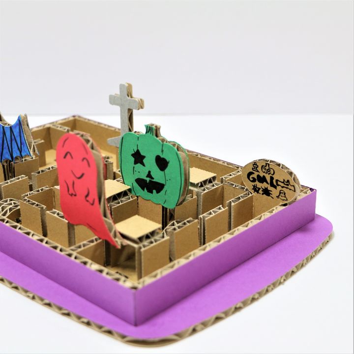 段ボール工作のワークショップを提案。つくりん堂の工作シリーズは全てクリエイターがオリジナルで設計デザインしていて、子どもたちにも大好評だそう。今回は、ハロウィンハウス工作、ビー玉コロコロ迷路ハロウィンバージョンなどを体験できます。